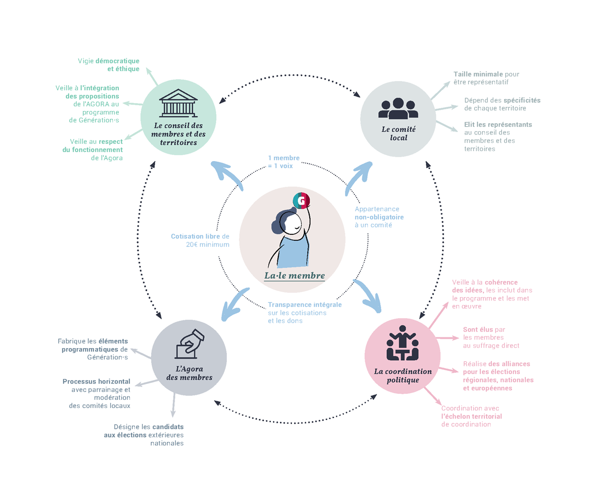 Un organigramme dont évidemment le membre est au centre ! Pouvant appartenir à un comité local, cellule territoriale clé, il est partie prenante de l’agora, la fabrique des idées de Générations-s. Il constitue par suffrage direct la coordination politique. Nous créons un conseil des membres et des territoires, une vigie démocratique et éthique. Il veille au fonctionnement démocratique et au respect des décisions de l’agora. Nous proposons que l’agora soit le cœur du mouvement dont tous les organes dépendent.